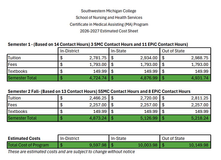 The Medical Assistant program is now a joint program between Bay and Southwestern Michigan Community College: you will be taking classes at both colleges. Don’t worry—it’s manageable, and we’re here to support you every step of the way.