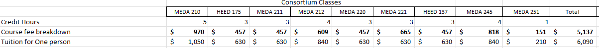 Cost is $210.00 per Credit hour in SMC/MCO courses with a $206.00 Additional tuition fee, see the Tuition and fees noted below per MEDA or HEED class.